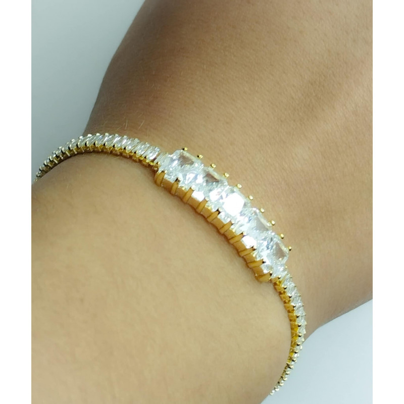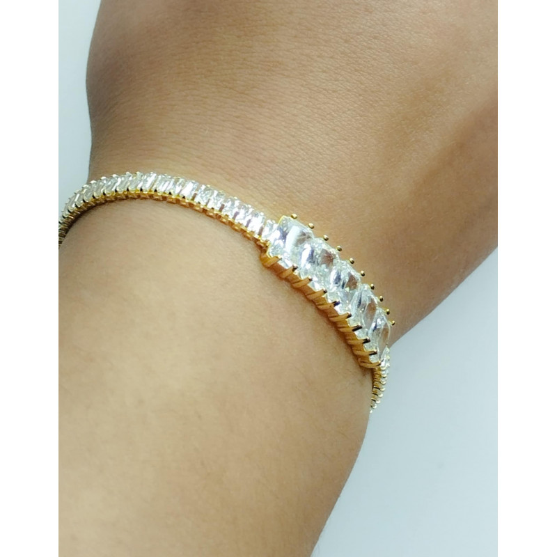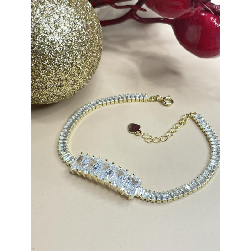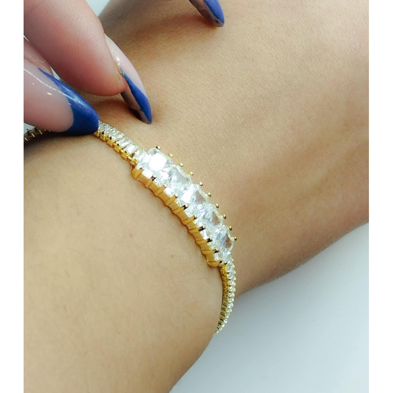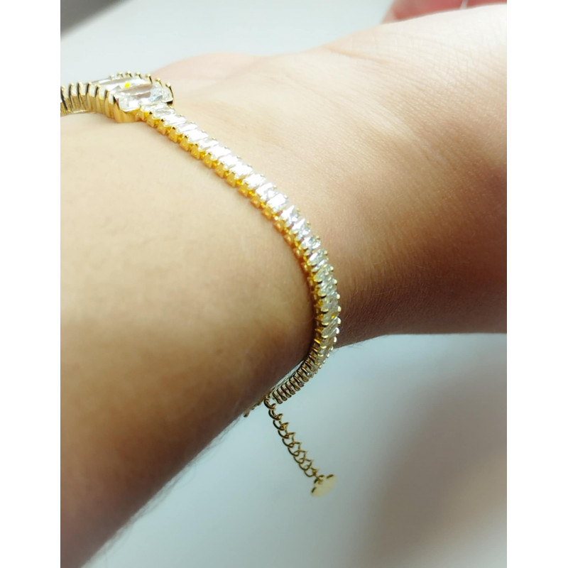 Λάμψτε με ενα υπέροχο λαμπερό βραχιόλι ριβιέρα με λευκά ζιργκόν μπαγιέτες εξαιρετικής ποιότητας, από επιχρυσωμένο ασήμι 925, με ρυθμιζόμενο μέγεθος