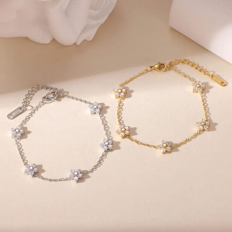 Πανέμορφο βραχιόλι με αλυσίδα και λουλουδάκια με λευκά ζιργκόν από επιπλατινωμένο ατσάλι εξαιρετικής ποιότητας που δεν μαυρίζει