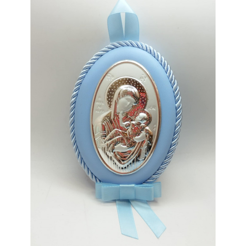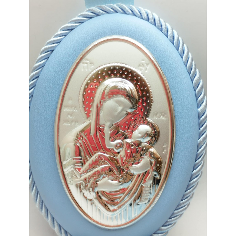 Πανέμορφο δώρο για νεογέννητο αγοράκι παναγίτσα η Μεγαλόχαρη για κούνια σιέλ χρώμα από ασήμι 925 σε διάσταση 11*8 εκατοστά