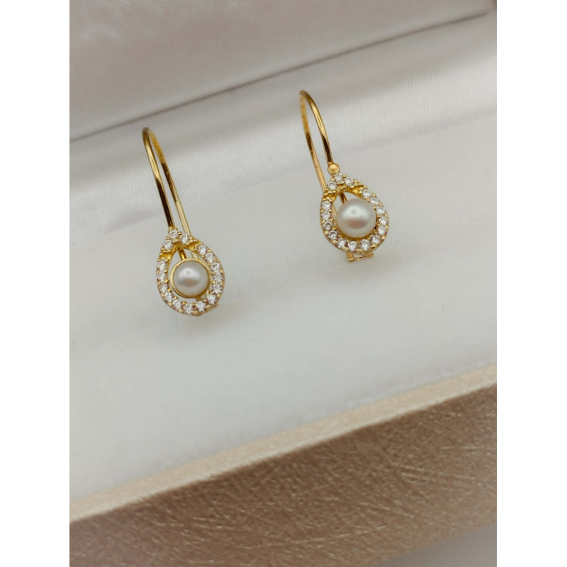 Πανέμορφα κρεμαστά σκουλαρίκια ροζέτα με λευκά ζιργκόν και φυσικό μαργαριτάρι, από χευσό 9 καρατίων